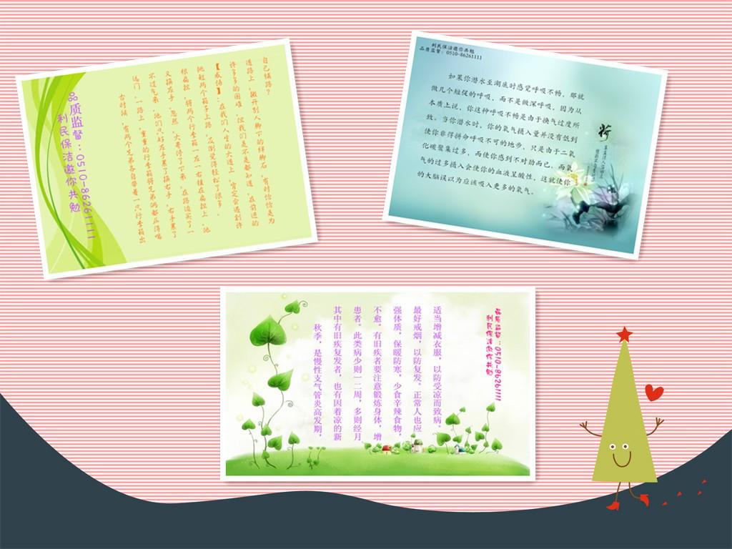 利民保潔在針對(duì)宣傳這一塊,有著自己的堅(jiān)持和卓著,不僅和多家網(wǎng)絡(luò)媒體合作,更擁有著自己的網(wǎng)絡(luò)宣傳團(tuán)隊(duì)。小編不巧就是其中一員,近期小編又在著手做一些宣傳的小圖片。記得做第一張樣品拿去塑封時(shí),被人當(dāng)成是小學(xué)生的作品,讓小編深感汗顏。后來(lái)翻閱無(wú)數(shù)前輩的“巨作”,小編總算略有“領(lǐng)悟”,順利做出幾張圖片后,小編也是非常高興的。